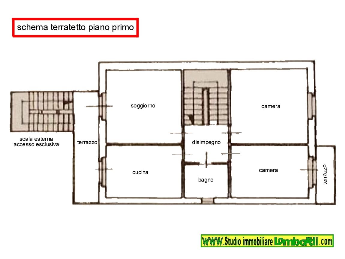 PIANO PRIMO - avente ingresso da scala esterna posta sul retro della costruzione, e composto da terrazzo-pianerottolo di mq 8, ingresso su soggiorno, cucina abitabile, 2 camere e bagno, superficie della casa di circa 95 mq; da una delle camere, si accede ad un terrazzo frontale, misurante 3 mq circa. Collegato alla casa e tramite scale interne, si accede alla soffitta, posta al secondo piano dell'edificio, composta da un'unica ampia stanza, ed attualmente al grezzo, presenta altezze che vanno da 1 metro fino a 2,70 metri, superficie di 95 mq circa.