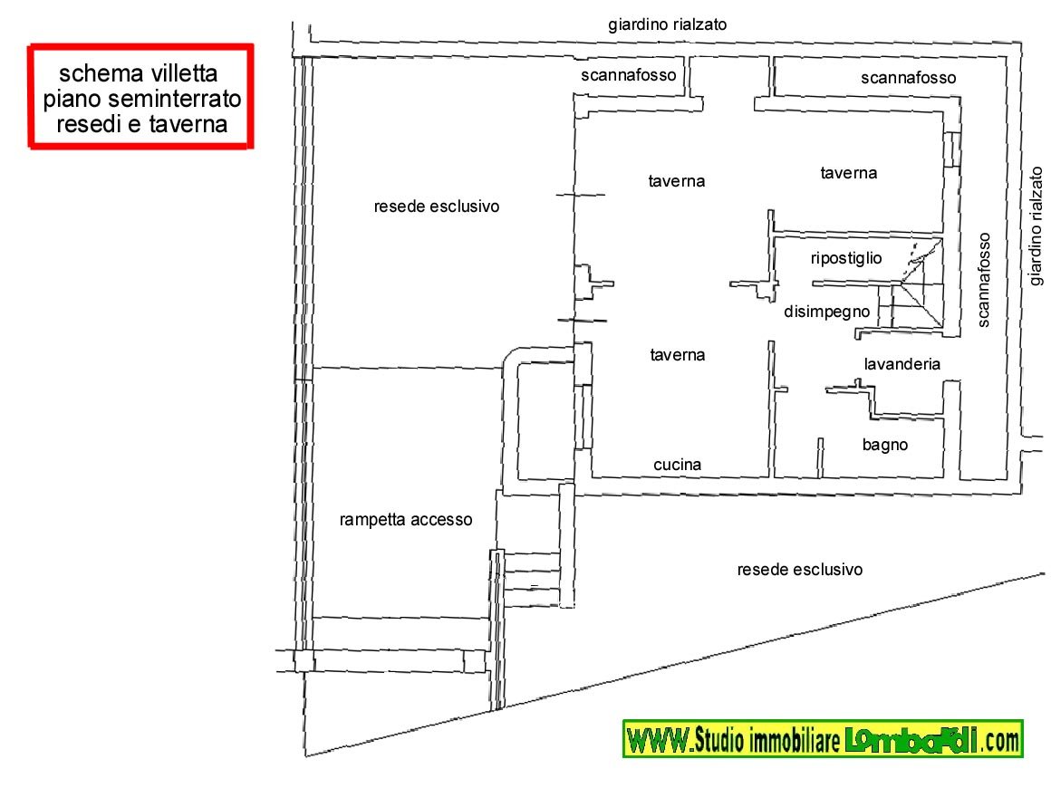 - PIANO SEMINTERRATO - vi si accede tramite resede esterno avente superficie di 75 mq circa, sul quale insistono i posti auto dell'abitazione, è caratterizzato da ampio salone con tinello, cucina a vista, lavanderia, ripostiglio, bagno, inoltre scannafosso sui due lati della casa seminterrati, e misurante circa 18 mq, mentre il piano della casa misura circa 65 mq.