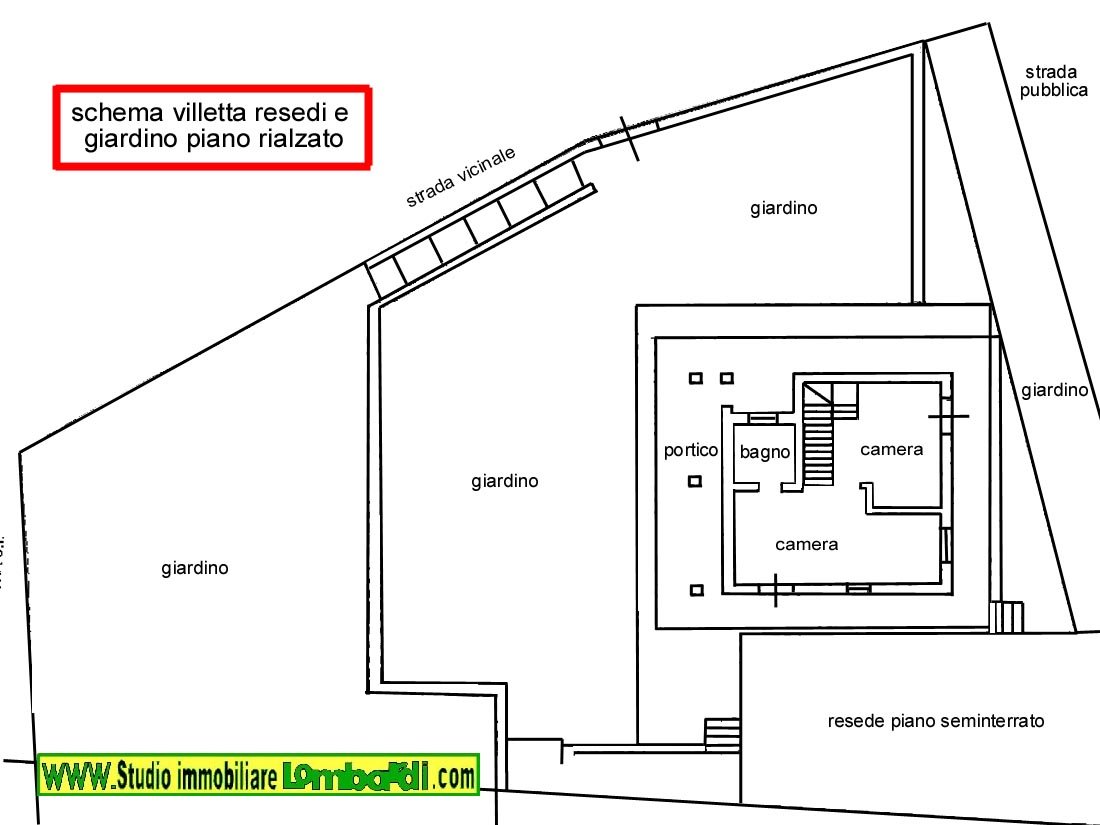 - PIANO RIALZATO - vi si accede tramite scala interna di collegamento con i locali prima descritti, mentre vi si accede tramite ingresso esterno principale dell'abitazione, anche da cancellino pedonale; attualmente è caratterizzato da due camere matrimoniali, cabina armadio e bagno, superficie del piano di circa 60 mq. All'esterno dell'abitazione, si sviluppa un giardino sui 4 lati, e misurante circa 550 mq, il tutto completamente seminato a prato all'inglese, contornato da bellissimi muri a pietra, sulla parte posteriore della casa in contiguità del giardino stesso insiste un bellissimo portico coperto di 25 mq circa.